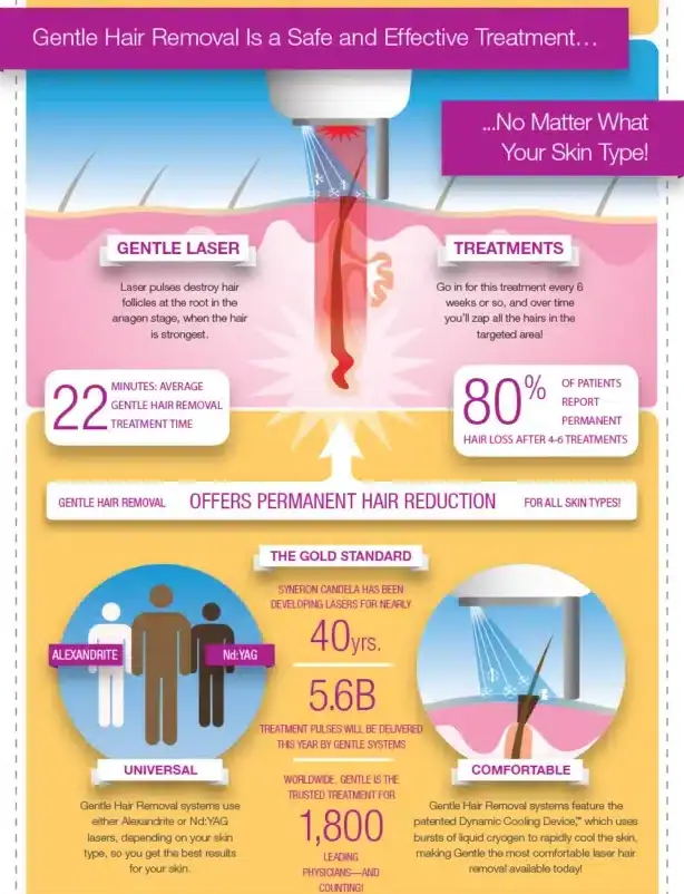 Laser Hair Removal, performed using the GentleMax Laser device, removes unwanted body hair safely and effectively. This procedure works by emitting targeted light into hair follicles, which absorbs pigment, destroying the hair. Laser Hair Removal can target various body areas, including the face, legs, arms, underarms, bikini line, and more. The versatility of this treatment makes it ideal for individuals looking for permanent hair removal.